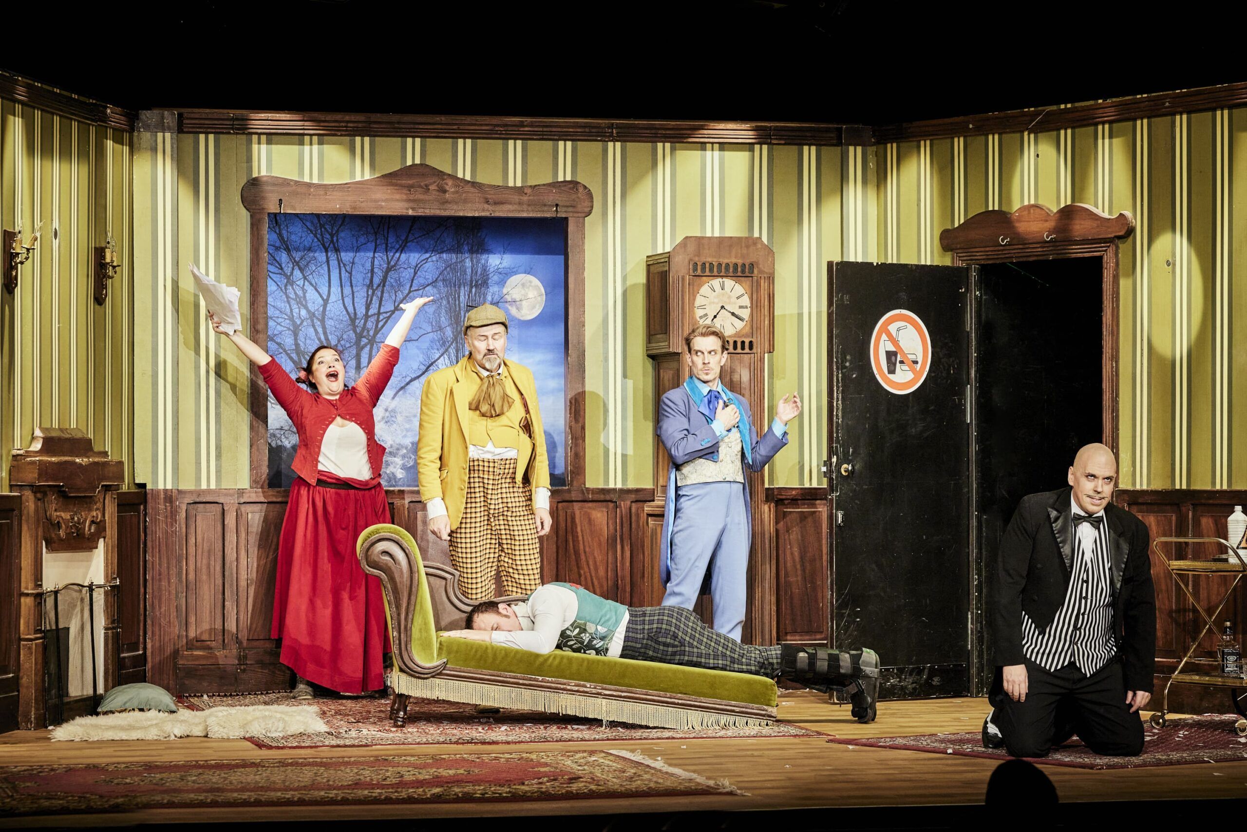 Imaginez 7 amateurs de romans noirs anglais qui décident de créer un spectacle alors qu’ils ne sont jamais montés sur scène ! Ils ont choisi une pièce inédite, un véritable chef-d’œuvre écrit par Conan Doyle lui-même (enfin, c’est ce qu’ils prétendent !)… L’action se situe fin XIXème, dans un superbe manoir, en plein cœur de l’Angleterre, lors d’une soirée de fiançailles. Les festivités vont enfin commencer quand un meurtre est commis. Chacun des invités présents dans le château devient alors… un dangereux suspect.